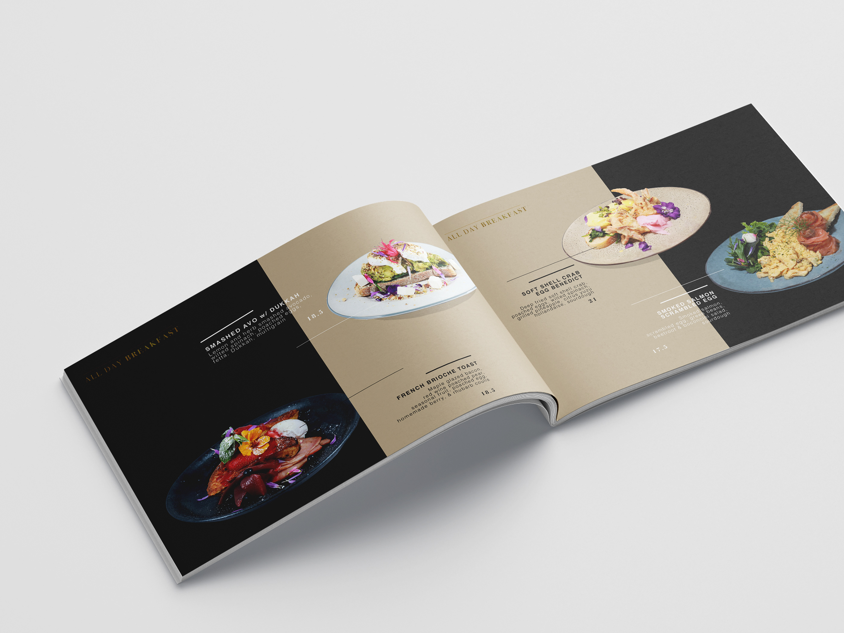 We achieved this through experimentation with layout and composition. We utilised a rectangular shape for the names of menu items and incorporated header food image and a gold texture for the heading to create a visually unified and balanced design. The typeface that we chose for this menu design is the similar font with the one that were used on the logo design.