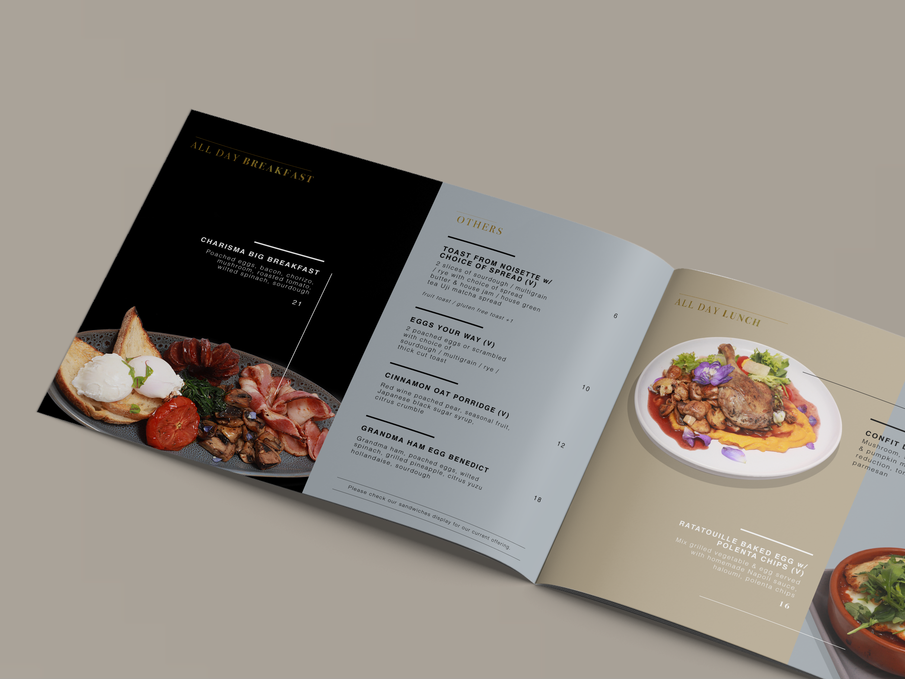 I have been assigned by Chopstick PR Marketing team with designing a menu for Charisma Workshop Cafe. Charisma Workshop in Melbourne CBD is a cafe located on Frederick Way offering a mix of patisseries, desserts, coffee, and savory food. It's known for its all-day breakfast and brunch options, along with a variety of desserts, including a popular waffle with a matcha ice cream.